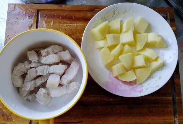 2、然後取出,用冷水沖洗幹凈,瀝幹備用。土豆去皮,洗凈,切成小塊。