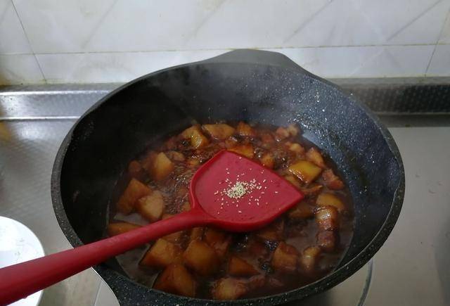10.燉10-15分鐘。然後倒入土豆塊翻炒,讓土豆塊浸入湯汁中。繼續用中火燉。