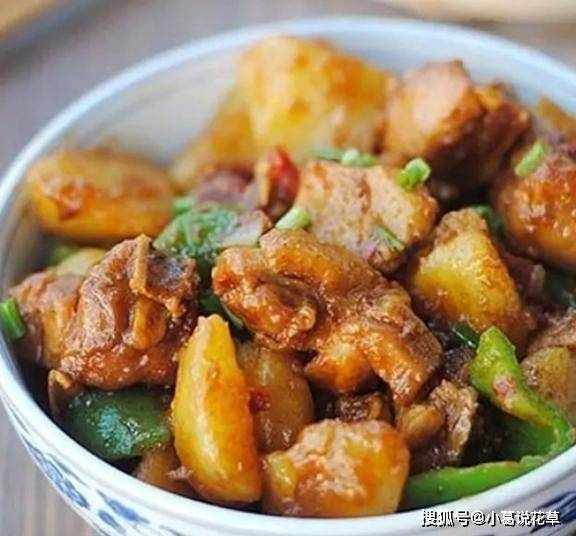 3.倒入沒過材料的溫水燒開,轉中小火燜煮;約5分鐘後加入馬鈴薯塊一起煮;文火煮至馬鈴薯變軟變粘,湯汁濃稠,加入青椒和洋蔥調味,大火加汁勾芡。
