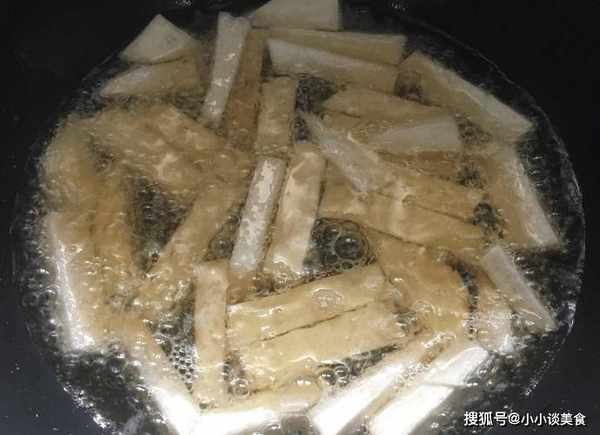 2.芋頭放一邊待用。開火後鍋內倒入油,先放入芋頭條加熱均勻。當芋頭表面呈金黃色時,即可關火,撈出芋頭。