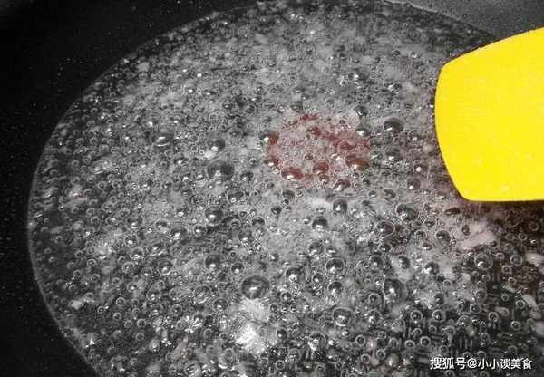 3、此時鍋內留少許食用油,放入白砂糖,待鍋開始冒泡時繼續攪拌。