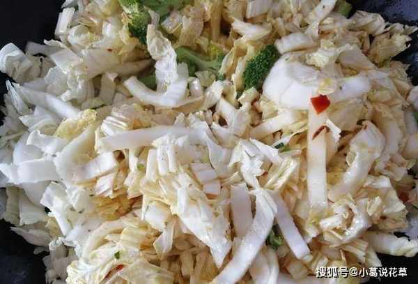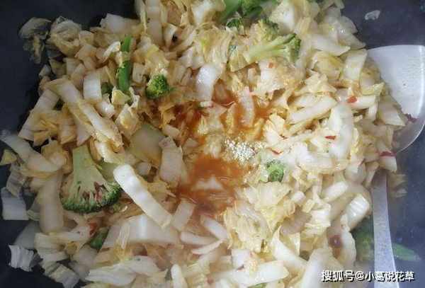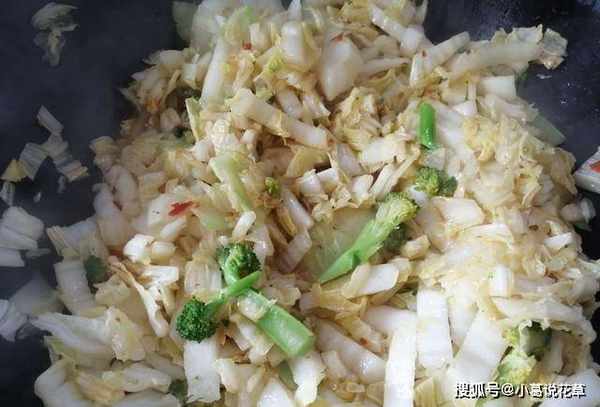 3.倒入卷心菜和西蘭花,翻炒幾下