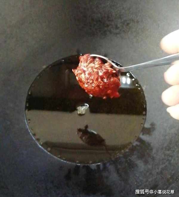 2、熱鍋冷油,放一勺豆瓣醬炒香。