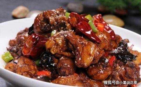 7、加入雞丁用大火翻炒1分鐘,加入料酒和糖;