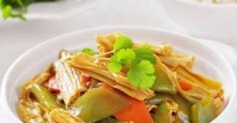 1.豆腐幹洗凈切條,胡蘿卜去皮切絲,青椒洗凈去蒂切絲。