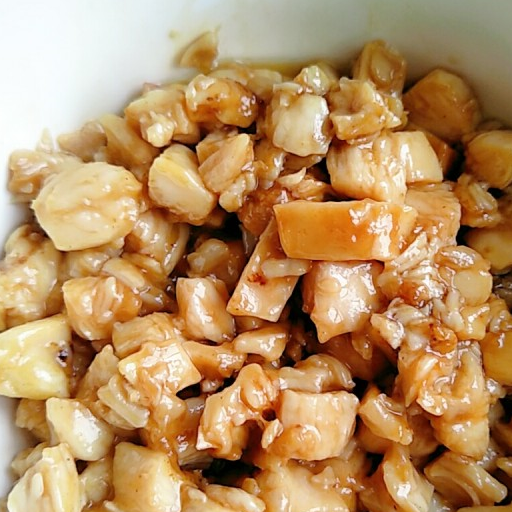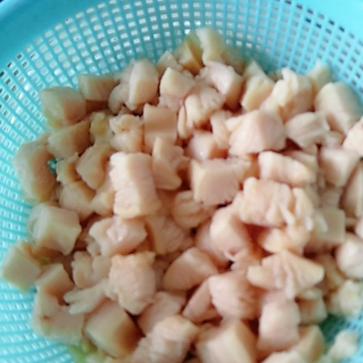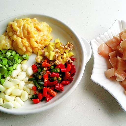 第2步、雞胸肉切成1.5cm見方的棋子小方塊,米椒切粒,大蒜切小段,大蒜頭整顆,薑切大粒,雞油切小塊。