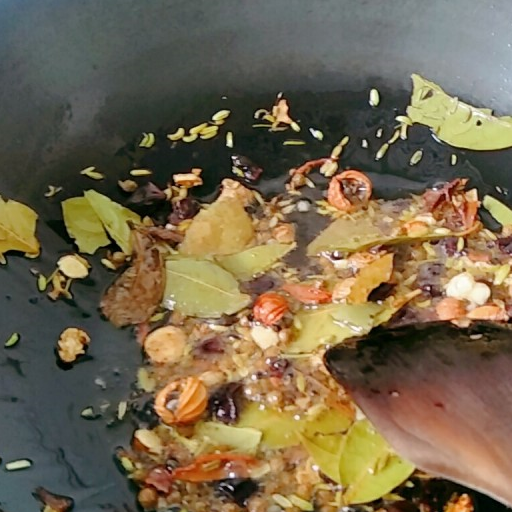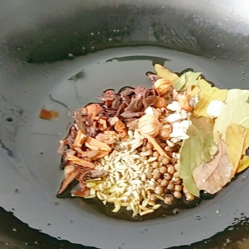 第8步、撈出油渣,小火,下所有的香料煸香。