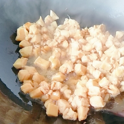第12步、油七成熱時,下雞胸肉爆香。
