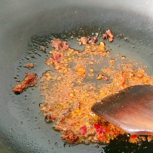第14步、鍋中留油,下火鍋底料小火煸出紅油。