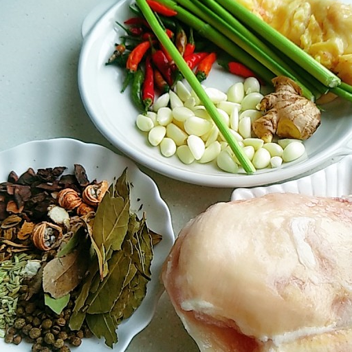 原料:雞胸肉、青米椒、大蒜、八角、桂皮、香葉、花椒、薑、沙薑、料酒、胡椒粉、生抽、淀粉、紅米椒、雞精、蠔油、火鍋底料。