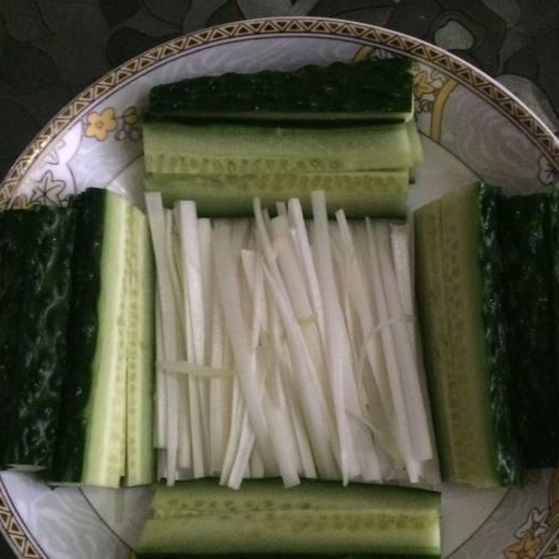 第3步、蔥白切絲擺盤中,周圍擺上黃瓜條裝飾。