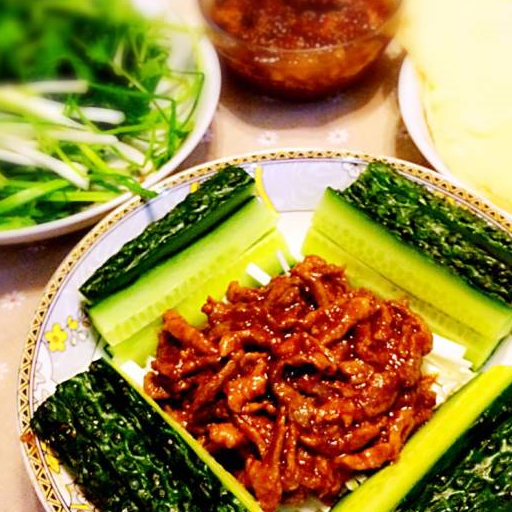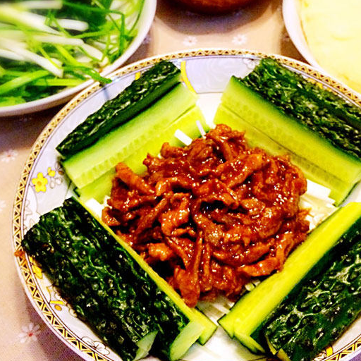 原料:豬瘦肉、黃瓜、大蔥蔥白、料酒、生抽、甜面醬、糖、鹽、淀粉、蛋清、薑。