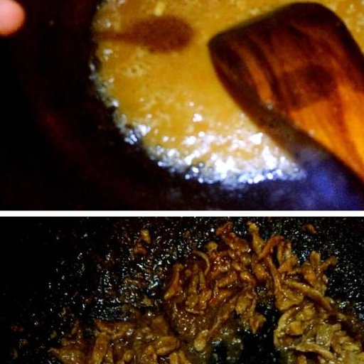 第5步、鍋中留少許底油,下適量甜面醬稍炒一下,將蔥薑水濾去蔥薑,將水倒入,可加少許老抽調色,再加1小勺白糖燒至湯汁濃稠,倒入肉絲炒勻即可。