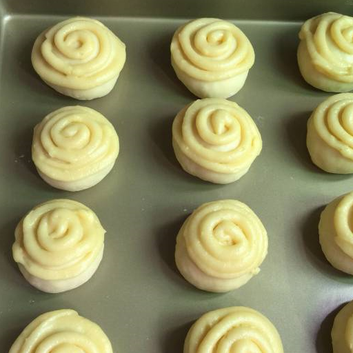 第12步、取出二發好的面胚,裱花袋剪小孔,將墨西哥醬擠在每一個面胚表面上。預熱好烤箱180度。