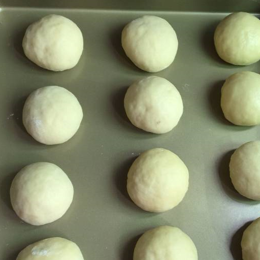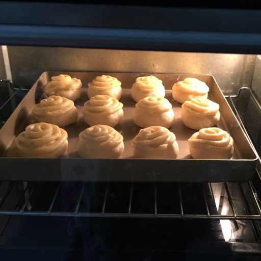第9步、將每一個造型好的生面胚放入烤盤裡。送入烤箱啟動發酵功能做第二次發酵至兩倍大。(發酵同時放杯溫水在底部,保持濕溫發酵)