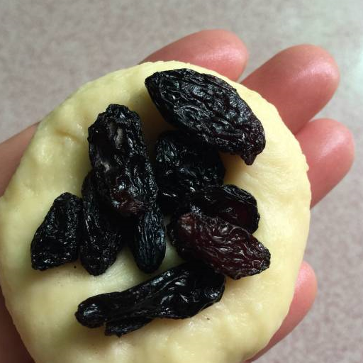 第7步、將松弛好的每一個面團各搟開,包入適量提子幹。