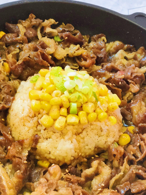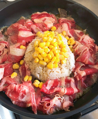 4、把肥牛鋪在鍋內,全程中小火,記得翻面煎,把鮮玉米粒倒在米飯上,撒點黑胡椒