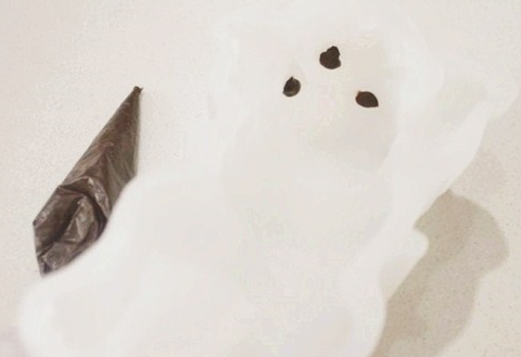 巧克力切碎隔水加熱,因為我們是在傢自制所以對於巧克力的顏色沒有什麼需求,等巧克力溶化後,取一點放到保鮮膜裡,用手擠在一個角落,底部剪開,放到沙皮狗模型裡,首先我們要把眼睛的部位添上,在放到冰箱裡。