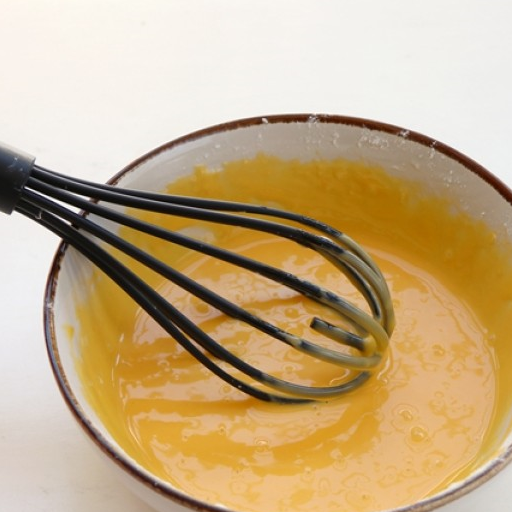 第2步、將牛奶和油混合,篩入面粉,加蛋黃液攪勻。