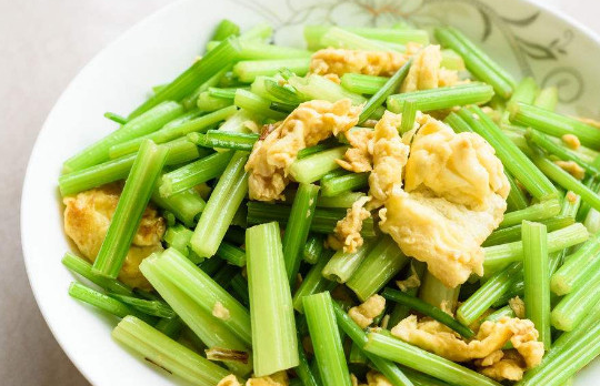 2、芹菜炒雞蛋:1、芹菜去根和老葉並清洗幹凈。2、雞蛋打散成蛋液,芹菜切成長約5毫米的小段。3、炒鍋入油燒至七八成熱時倒入芹菜,炒鍋入油燒至七八成熱時倒入芹菜,接著倒入蛋液。4、大火將芹菜和雞蛋炒勻炒熟即可出鍋。