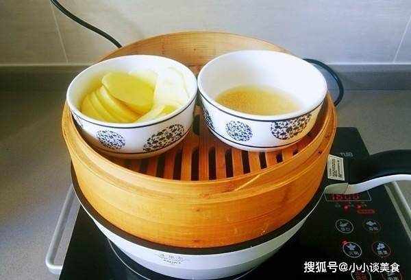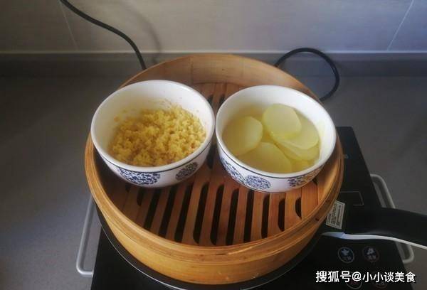 2.土豆去皮,切成片。沖洗幾次,然後將它們放入容器中。將小米洗凈,放入碗中。加入約30克水,將裝有小米和薯片的碗放入蒸鍋。