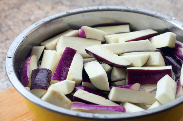 1、提前準備好所需要的食材,新鮮的茄子清洗幹凈之後去蒂,然後用刀切成長條。接下來要醃制茄子,這就是大廚告訴我的小技巧,取一個盆子,將切好的茄條放入盆中,倒入適量的清水,再加入適量的鹽,醃制10分鐘。這樣做可以將茄子中的水分殺出來,使茄子變得更加緊密,而且茄子的顏色也不會變黑,非常實用哦!
