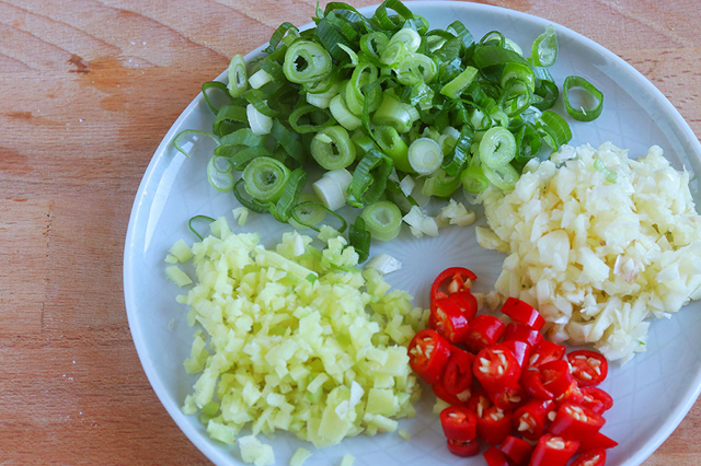 2、利用醃制茄子的時間,我們來處理其它食材,蔥清洗幹凈用刀切成蔥花、生薑、大蒜去皮切成薑末和蒜末,小米辣清洗幹凈切成辣椒圈備用。
