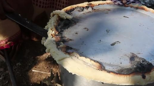 放好米之後,把這個鍋的鍋蓋蓋,周邊在糊上一些面粉,把鍋蓋裡的東西放到火上燜熟。
