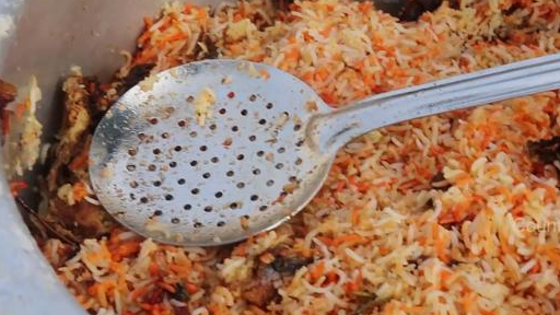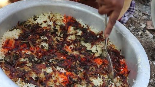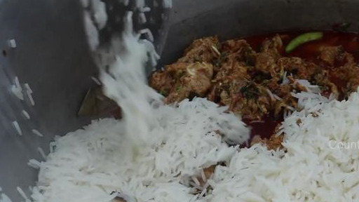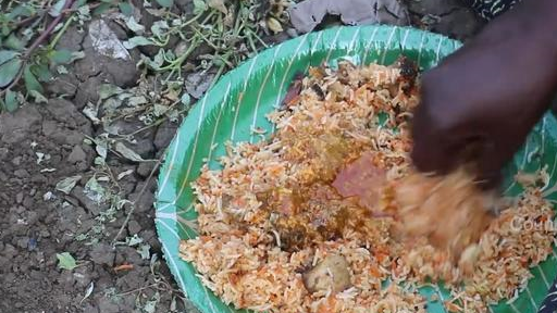 接下來她又用水煮瞭一些米飯,把這些米飯煮到半熟。然後又另外支起瞭一個大盆,先是把醃好的雞肉放到盆子的底部,再把煮到半熟悉的米飯鋪在雞肉的上面。米放好之後,又在大米上澆瞭大量的咖喱醬。