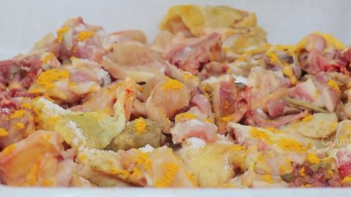把這些雞肉放到盆子裡,又在裡面放上她親自調的大量的咖喱粉。把雞肉拌均勻瞭,然後放在一邊醃制,等會的是要用到的。