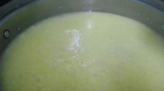 5.邊煮邊用鍋鏟不時攪拌,此時不能離開鍋邊,要不停攪拌小米,防止粘鍋,幹水,如果覺得小米難以攪動,水分太幹,中途可以加水