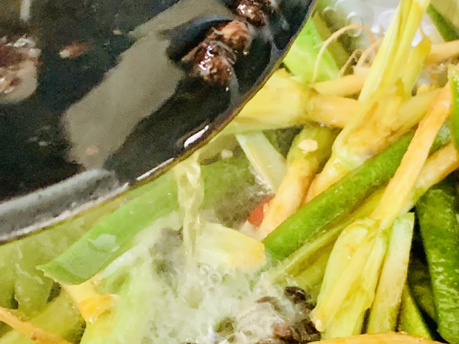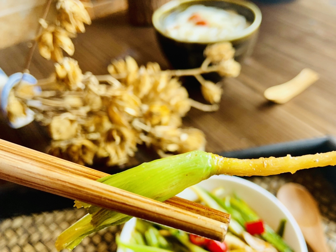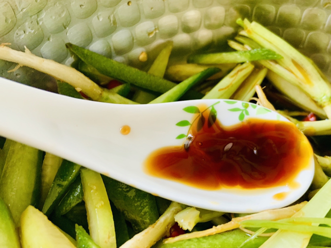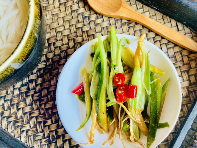 我們把香菜根和老莖一起徹底洗掉老泥,去掉腐朽的葉子。香芹的根洗凈,用勺刮掉是外面的葬皮。蘿卜皮洗凈切成跟香菜一樣長短的小條。小米椒5個,切小粒。