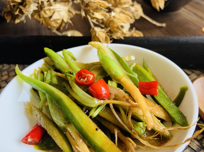 把菜攪拌均勻,熱鍋熱油放幾顆花椒,然後把花椒炸出香味,油連同花椒一起趁熱倒入菜根裡,拌勻。