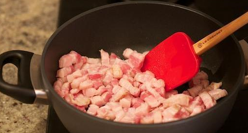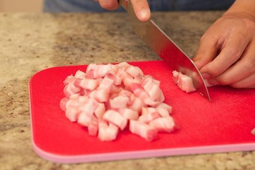 準備一個比較深點的厚底不粘鍋,大火燒熱2分鐘,切記別放食用油,而是將切好的肉丁直接倒進不粘鍋裡翻炒。