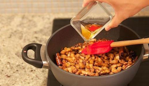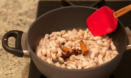 一開始鍋裡沒有多少液體,繼續加熱,豬肉會突然滲出不少水分,這個時候鍋裡的汁液開始慢慢變得渾濁。這時候就需要大傢有點耐心瞭,需要不斷的翻炒,直到鍋裡的水分慢慢全部蒸發掉,鍋裡的液體隻剩下油脂為止。