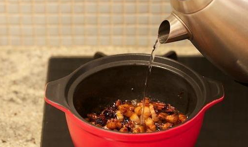 把所有的肉丁倒進燉鍋裡面,並且要繼續翻炒,炒到鍋裡的水分基本上收幹以後,這時再倒開水進去,開水的量要能蓋住所有肉丁。