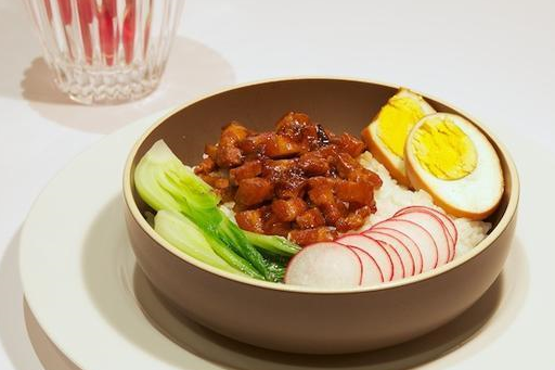 把蒸好的米飯盛在碗裡,鋪上鹵肉,然後配上菜心、櫻桃繼蘿卜和鹵蛋,一碗風靡大江南北的臺灣鹵肉飯就做好瞭。