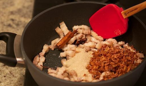放入八角、桂皮、紅蔥酥和紅糖,翻炒均勻。加入老抽和紹興黃酒,再次翻炒均勻。