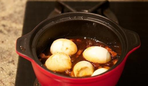 我們在燉肉丁的時候,就可以把雞蛋煮熟然後剝皮備用。當肉丁燉到30分鐘的時候,就把雞蛋放進鍋裡擺在肉丁上。