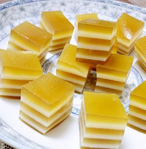 然後我們也就可以把已經準備好的模具放進蒸鍋上面接著再用刷子在底部刷上一層植物油之後,再往裡面倒入少許的黃色漿液,再蓋上鍋蓋,大概蒸兩分鐘的時間,等到漿液完全凝固瞭之後,也就可以往裡面倒入少許的白色漿液,等到凝固瞭之後再以此類推的添加黃色漿液和白色漿液,直到全部的漿液都弄完瞭之後,就可以正好取出來放置冷卻,切成一小塊拿來使用。而對於像這樣的方法制作出來的馬蹄糕,它的口感還真的是軟糯q彈,對於上面所說的這些,也就是馬蹄糕別在外面買,自己在傢就能做,方法簡單,q彈細膩很好吃。