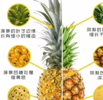 如果單從外觀上來看,菠蘿和鳳梨幾乎長得一模一樣,不過鳳梨的口感要比菠蘿好很多,而且在吃的時候也是不用淡鹽水泡直接就可以吃。想要分辨菠蘿和鳳梨,其實很簡單的,我們隻需要看它們的葉子就能分辨出來,菠蘿的葉子有鋸齒,而鳳梨都沒有,所以大傢以後在買鳳梨時可要看仔細瞭,別買成便宜的菠蘿。
