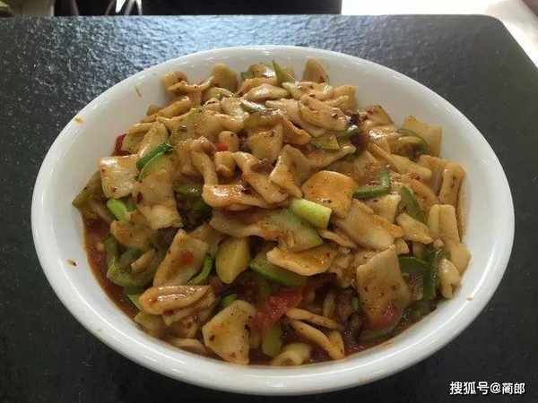把羊肉與土豆、粉條、青紅椒加密制調料燉熟而成,配菜裡加些手搟粉,和湯汁拌著吃非常美味。