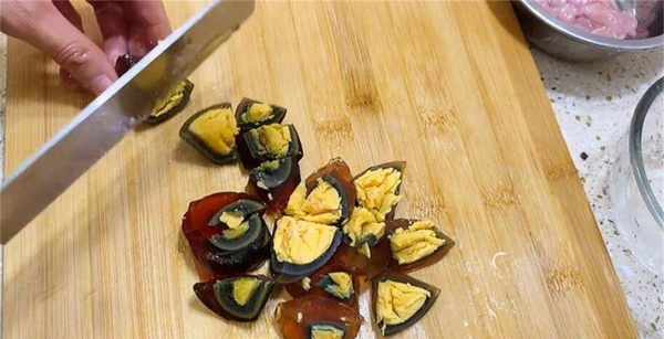 4、再準備2顆皮蛋,徒手剝掉外殼,再用刀把它切小塊一些,切好後把它裝入碗中備用。