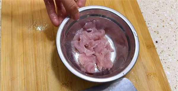 3、準備一小塊瘦肉,把它切成薄片,切好之後裝入碗中,再加入一勺食鹽,一點點花生油,下手把它抓拌均勻,放一盤醃制幾分鐘備用。