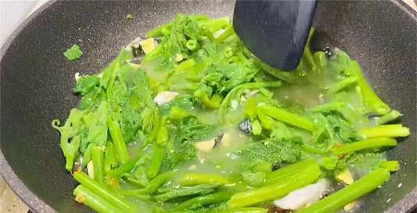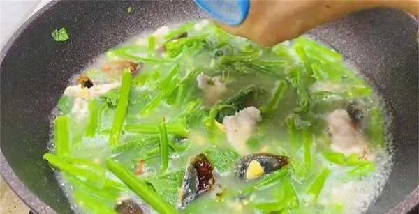 8、燒開後再把瘦肉加進來,南瓜苗也放進來,用鏟子把南瓜苗翻拌均勻,把瘦肉和南瓜苗給煮熟就行瞭。