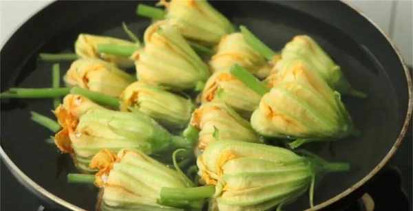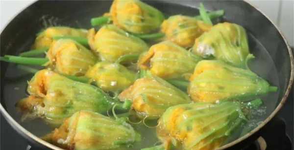 8、鍋中燒熱,不用刷油,把放入剩下的南瓜苗放進去,再均勻地放入南瓜花釀,接著加入適量的開水。水量要沒過南瓜花釀的1/2處。