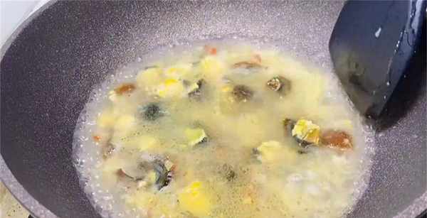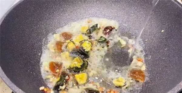 6、起鍋燒油,下入蒜末和小米椒,炒出香味,再把皮蛋放進去煎一下,皮蛋被煎過後,煮出來的湯就會變成奶白色,喝起來也比較香濃。