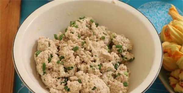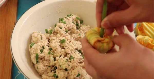 6、餡料做好後,取來一個南瓜花,用勺子舀出餡料,直接裝進南瓜花裡面,最好給它壓一壓,把花瓣也塞到裡面去,再用南瓜苗固定住形狀。