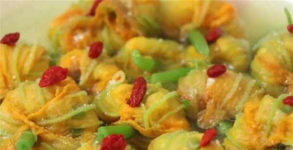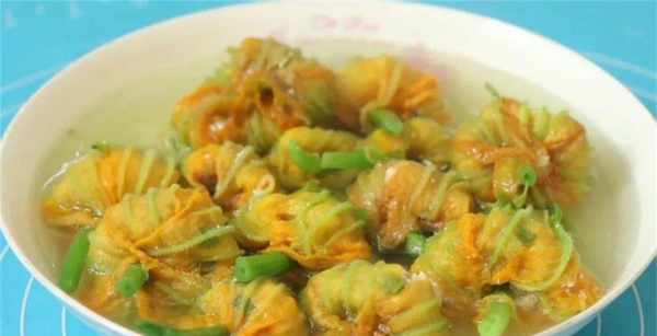 10、這一道南瓜花釀肉就做好瞭,湯甜花美,氣質好極瞭,非常有營養,如果大傢為瞭增加賣相,還可以再點綴上幾顆枸杞,這樣就更加完美瞭。