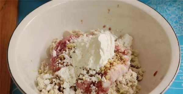 4、接著把豆腐和肉末放在一起,再加入一點薑末,調味加入生抽、蠔油、食鹽、淀粉,用筷子充分地攪拌均勻,最後淋上一點香油,稍微攪拌幾下。